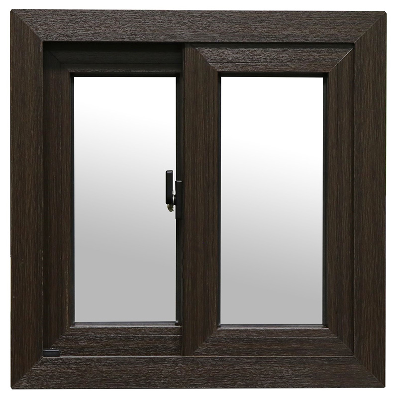 Ventana en color nogal oscuro con protección UV, 1 hoja fija 1 hoja corrediza, vidrio claro de 4mm, cerrojo + mosquitero